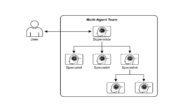 5. 层次化: "层次化"模型扩展了监督者概念,创建了多层组织结构。这涉及多个监督者级别,高级监督者监督低级监督者,最终在最低层有一组操作智能体。此结构非常适合可分解为子问题的复杂问题,每个子问题由层次结构的特定层管理。它提供了一种结构化的可扩展性和复杂性管理方法,允许在定义的边界内进行分布式决策。