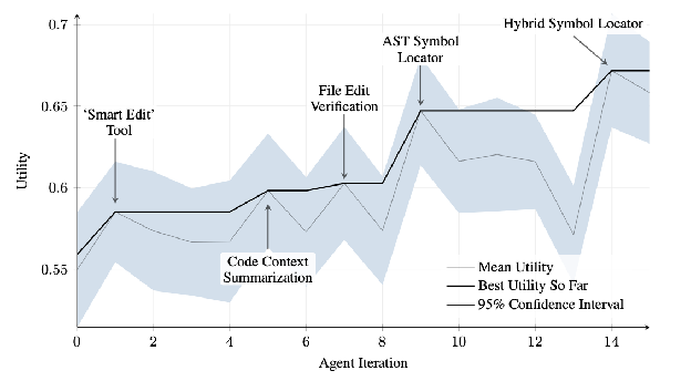图 2:跨迭代的性能表现。关键改进用其相应的工具或智能体修改进行标注。(由 Maxime Robeyns、Martin Szummer、Laurence Aitchison 提供)